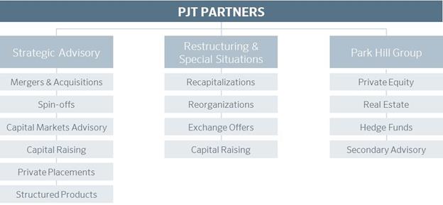 PJT Partners Inc. was formed in connection with certain merger and spin-off transactions whereby the financial and strategic advisory services, restructuring and reorganization advisory services and Park Hill Group businesses of The Blackstone Group L.P. (“Blackstone”) were combined with PJT Capital LP, a financial advisory firm founded by Paul J. Taubman in 2013 (together with its then affiliates, “PJT Capital”), and the combined business was distributed to Blackstone’s unitholders to create PJT Partners Inc., a stand-alone, independent publicly traded company. PJT Partners Inc. is a holding company and its only material asset is its controlling equity interest in PJT Partners Holdings LP, a holding partnership that holds the company’s operating subsidiaries, and certain cash and cash equivalents it may hold from time to time as described in “Part II. Item 5. Market for Registrant’s Common Equity, Related Stockholder Matters and Issuer Purchases of Equity Securities—Dividend Policy.” As sole general partner of PJT Partners Holdings LP, PJT Partners Inc. operates and controls all of the business and affairs of PJT Partners Holdings LP and its operating entity subsidiaries.