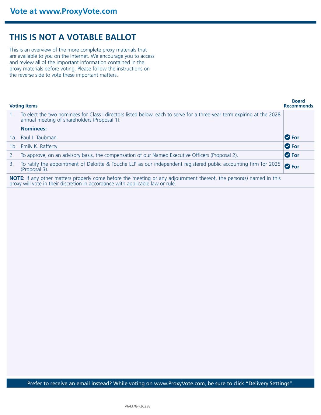 Vote at www.ProxyVote.com Prefer to receive an email instead? While voting on www.ProxyVote.com, be sure to click “Delivery Settings”. Voting Items Board Recommends V64378-P26238 THIS IS NOT A VOTABLE BALLOT This is an overview of the more complete proxy materials that are available to you on the Internet. We encourage you to access and review all of the important information contained in the proxy materials before voting. Please follow the instructions on the reverse side to vote these important matters. 1. To elect the two nominees for Class I directors listed below, each to serve for a three-year term expiring at the 2028 annual meeting of shareholders (Proposal 1): Nominees: 1a. Paul J. Taubman For 1b. Emily K. Rafferty For 2. To approve, on an advisory basis, the compensation of our Named Executive Officers (Proposal 2). For 3. To ratify the appointment of Deloitte & Touche LLP as our independent registered public accounting firm for 2025 (Proposal 3). For NOTE: If any other matters properly come before the meeting or any adjournment thereof, the person(s) named in this proxy will vote in their discretion in accordance with applicable law or rule.
